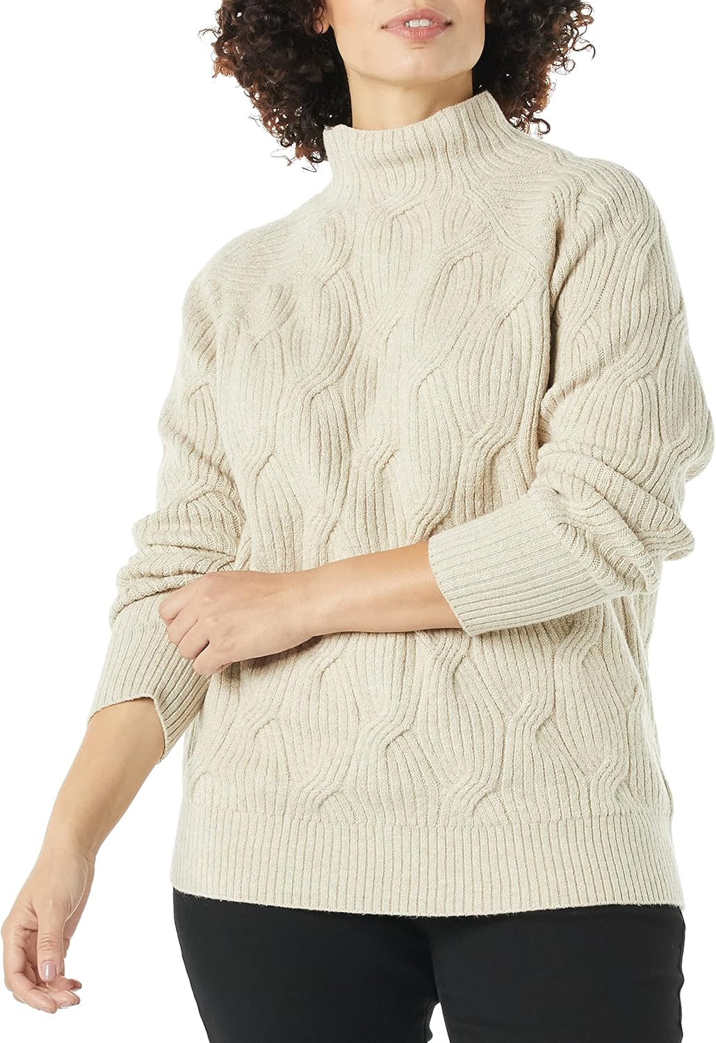 Cozy beige winter sweater with soft funnel neck and cable knit design. Perfect for layering, available in sizes XXS to 3X.
